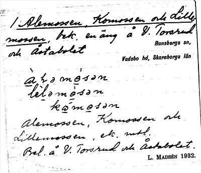 Information om ortnamnet Alemossen, Komossen och Lillemossen